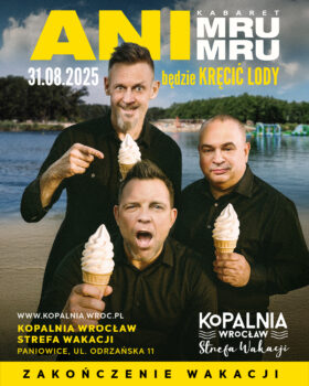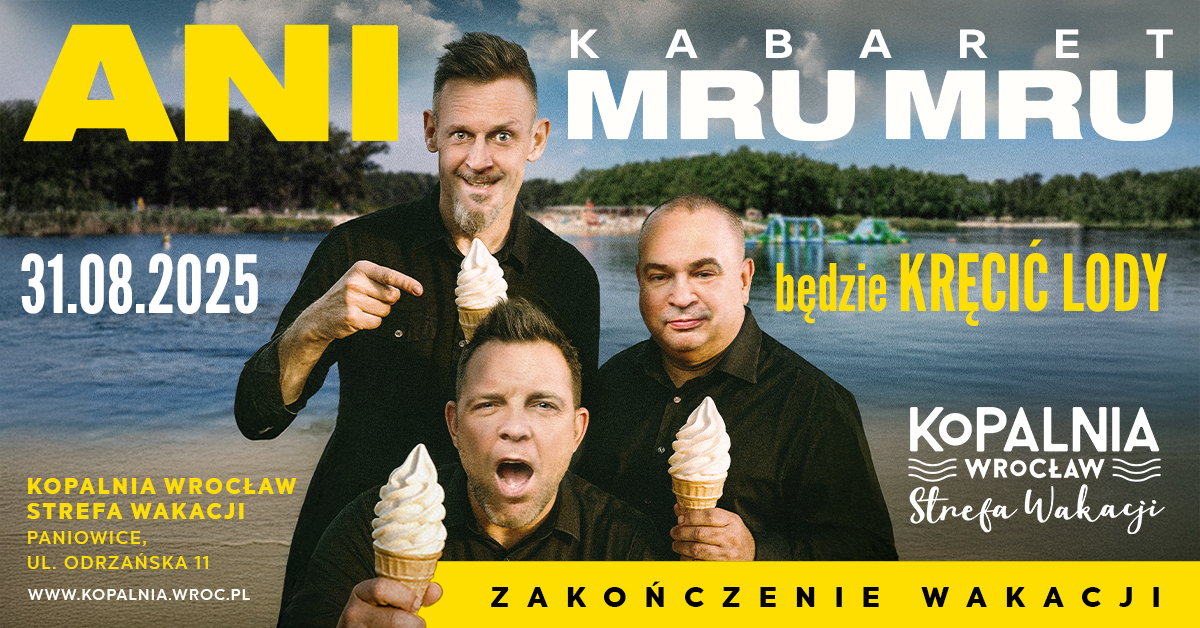 Na nasz obiekt Kopalnia Wrocław Strefa Wakacji w Paniowicach przyjeżdża Kabaret Ani Mru-Mru – artyści, którzy od lat bawią całą Polskę. I to nie tylko klasycznymi skeczami, które wszyscy znamy, ale tym razem w nietypowej odsłonie: będą dosłownie kręcić lody. Tak, dobrze czytacie – śmiech, żarty i pyszne lody w jednym. A do tego plażowy klimat, muzyka, woda i ostatni dzień lata spędzony na luzie.