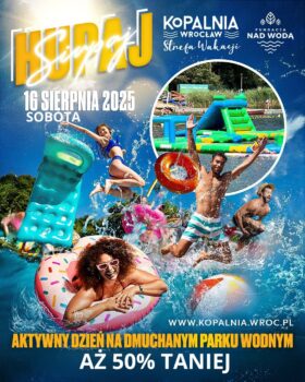Tego dnia sercem Kopalni Wrocław będzie Dmuchany Park Wodny – tor przeszkód na wodzie, który gwarantuje emocje niezależnie od wieku. Konstrukcja jest zamocowana do dna, co zapewnia stabilność i bezpieczeństwo. Wśród atrakcji znajdziecie: