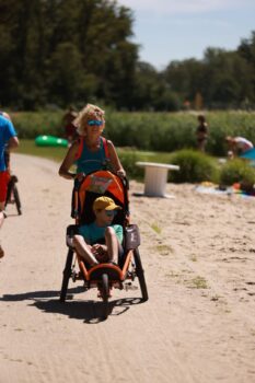 Na początku para wyrusza na trasę 1000 metrów pływackich. Osoba z niepełnosprawnością płynie w pontonie, który holuje, płynący partner. Potem – już na lądzie – przychodzi czas na bieg. Osiem kilometrów wspólnej trasy, gdzie osoba z niepełnosprawnością zasiada w specjalnym wózku sportowym lub handbike’u, a partner biegowy pcha go przed sobą.